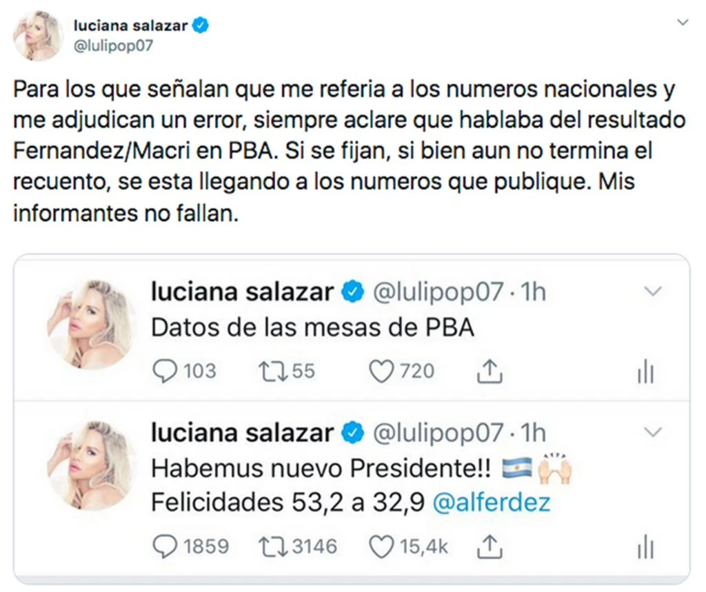 Luego de que Cinthia Fernández la acusara en Los Ángeles de la Mañana de cobrar por sus tuits en los que brinda información política, Luciana Salazar se autodenunció para que la Justicia la investigue.