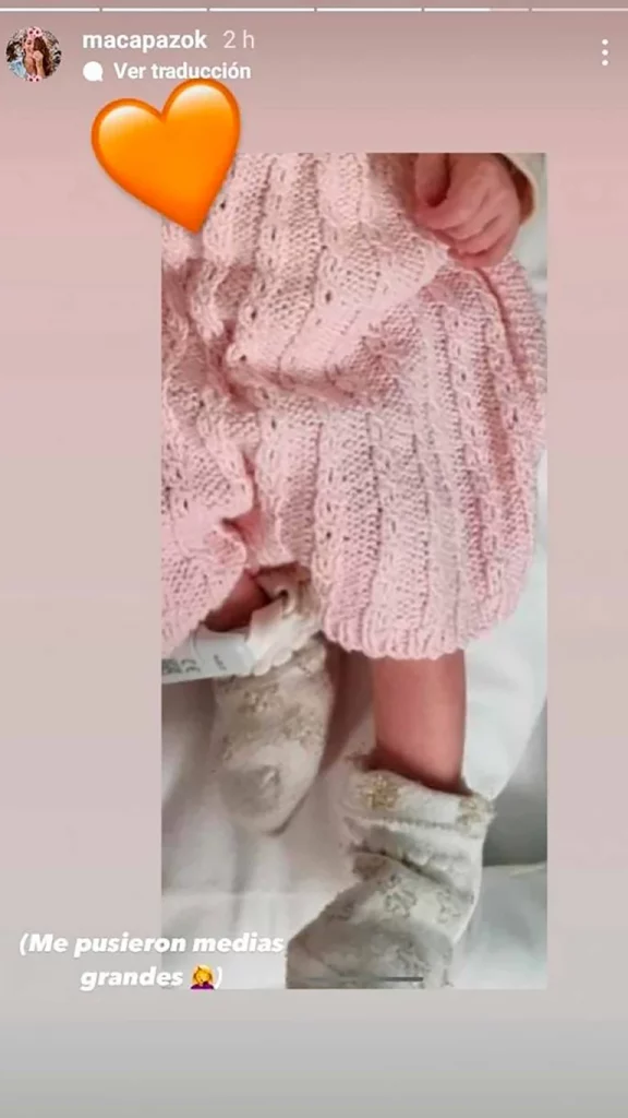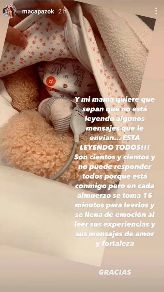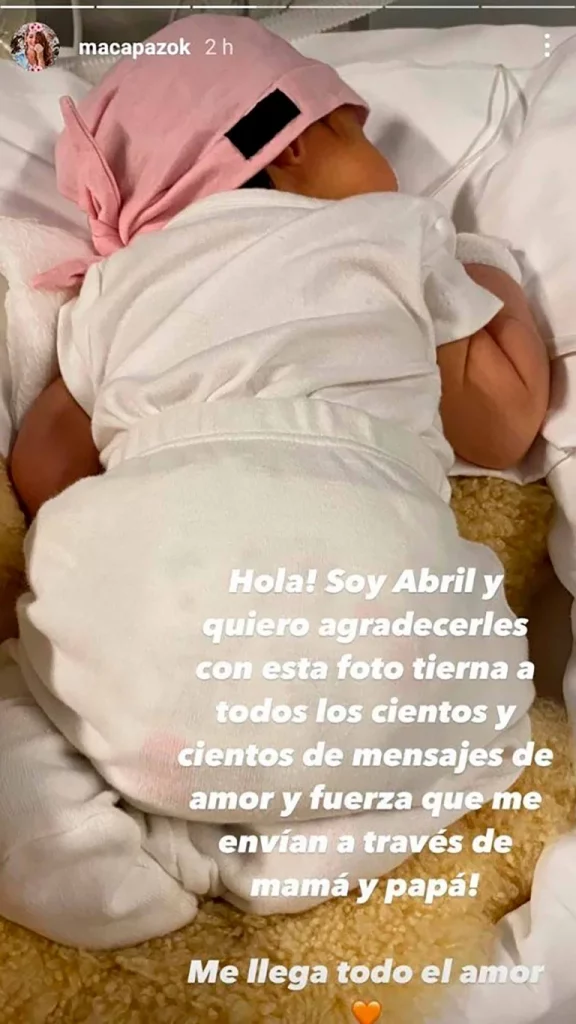 En otra imagen, Macarena mostró la evolución de la beba, quien continúa en neonatología. “Y mi mamá quiere que sepan que no está leyendo algunos mensajes que le envían. Está leyendo todos”, agregó, como si fuera la pequeña Abril quien se dirige a sus más de 100 mil seguidores de Instagram.