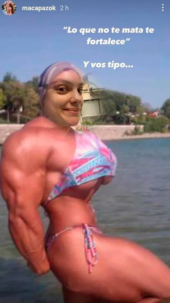 Por otro lado, intentando distenderse Macarena Paz compartió un meme con una frase que suele escuchar desde que nació su hija: “Lo que no te mata te fortalece”. La actriz agregó “Y vos tipo…” junto a una foto de su cara en un cuerpo de una mujer fisicoculturista.