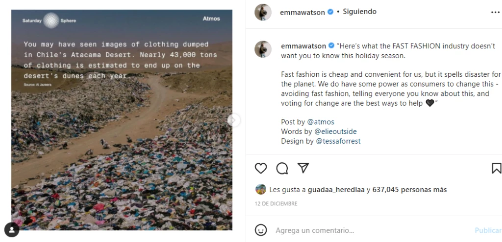 Entre las principales defensoras del medioambiente se encuentra la actriz Emma Watson, conocida por interpretar el papel de Hermione Granger en la saga Harry Potter. La celebridad británica la semana pasada utilizó sus redes sociales para concientizar los problemas que han traído los residuos textiles en el desierto de Atacama, Chile. Las imágenes compartidas por Watson fueron capturadas por la agencia France Press en noviembre de 2021. En las mismas puede verse toneladas de ropa (unas 59.000 al año) amontonandose sobre uno de los desiertos más secos del mundo, dañando el ecosistema.