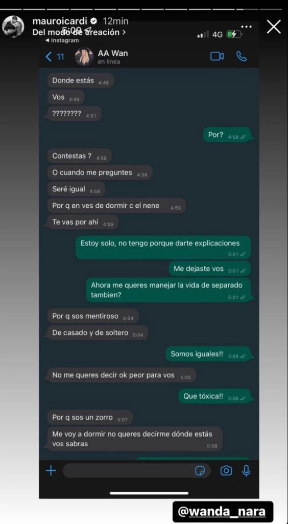 Ante los mensajes de Wanda y llamados desesperados, Mauro decidió responderle de inmediato: "Estoy solo, no tengo porque darte explicaciones, me dejaste vos. ¿Ahora me queres manejar la vida de separado también?", respondió muy harto el futbolista.