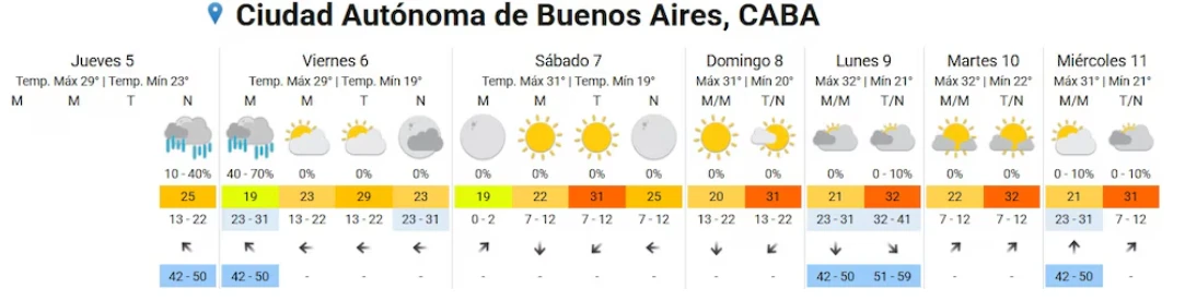 Según el Servicio Meteorológico Nacional (SMN), el resto del viernes se mantendrá sin probabilidad de precipitaciones. Por lo que se espera una jornada con una temperatura máxima de 29 °C y una mínima cercana a los 19 °C, en un contexto de mayor estabilidad atmosférica.