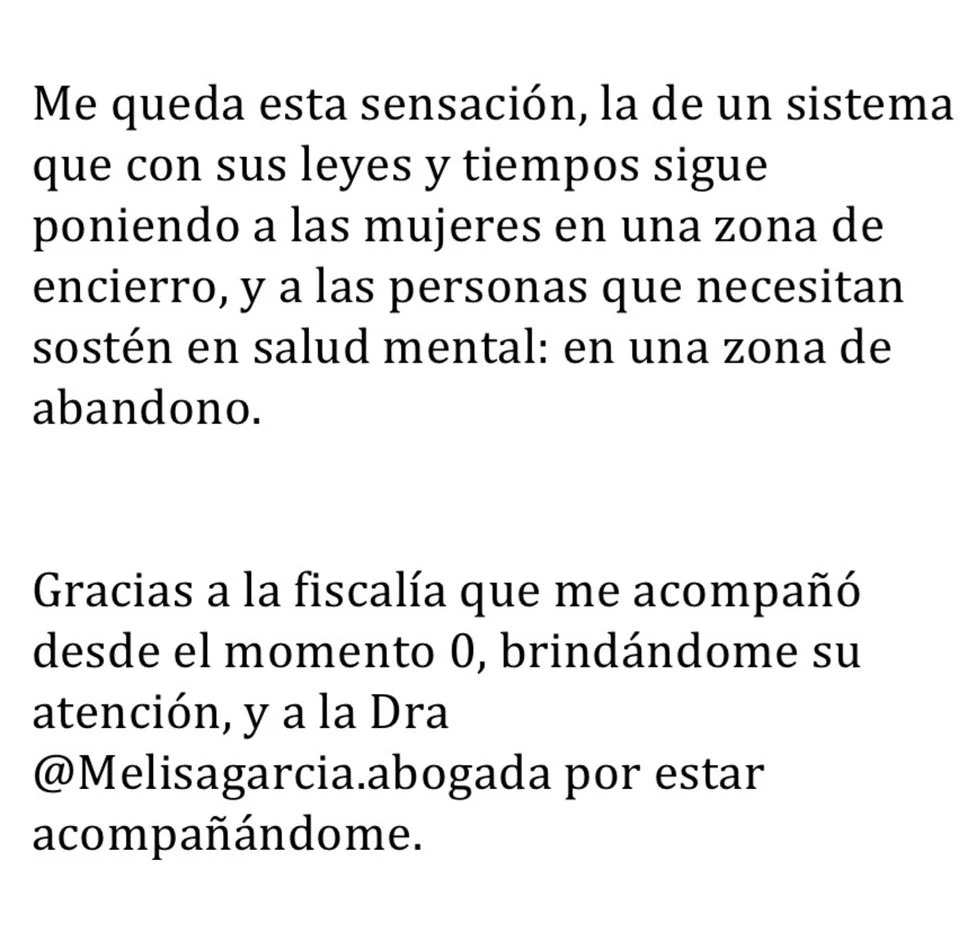 "Me queda esta sensación, la de un sistema que con sus leyes y tiempos sigue poniendo a las mujeres en una zona de encierro, y a las personas que necesitan sostén en salud mental en una zona de abandono", afirmó Celeste.