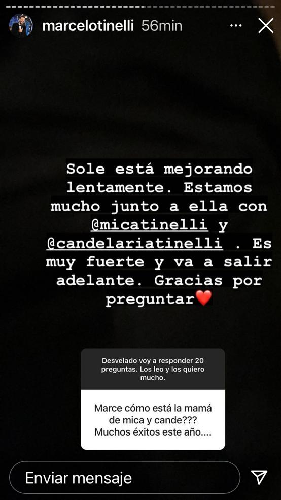 Aquino se está reponiendo favorablemente, aunque aún presenta cierta desorientación debido a la medicación que necesitó para estabilizarse, además del cuadro base por el que fue ingresada. "Está mejorando lentamente. Estamos mucho junto a ella con Mica y Cande. Pero es muy fuerte y va a salir adelante", dijo Marcelo hace unos días.