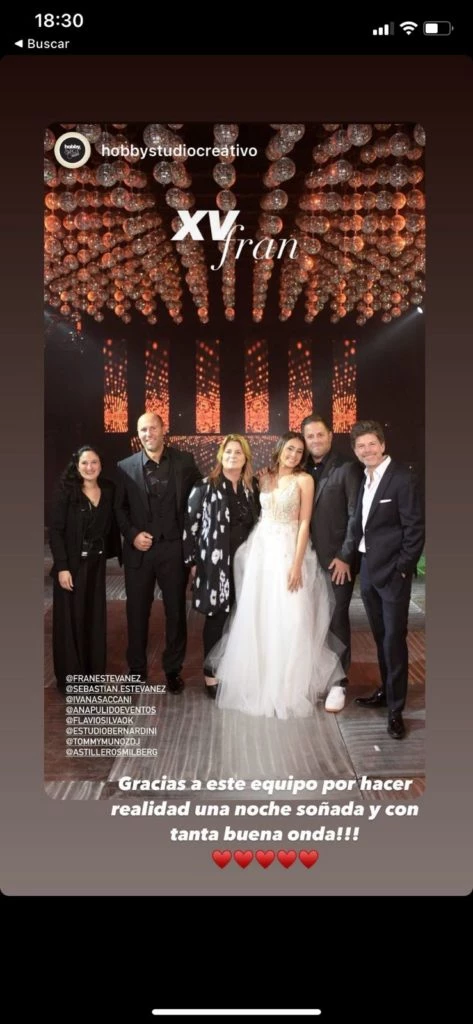 "Gracias a este equipo por hacer realidad una noche soñada y con tanta buena onda", comentó el actor en una de las historias que reposteo del estudio Hobby Studio Creativo en el que se puede apreciar a su hija Francesca con su vestido blanco acompañada de su familia y los organizadores del evento.