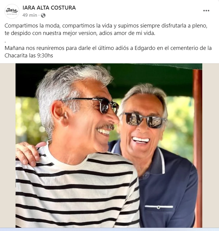 Desde la cuenta oficial en redes sociales de Iara confirmaron la muerte de Edgardo. Su compañero desde 1989, Mario Vidal, expresó: "Compartimos la moda, compartimos la vida y supimos siempre disfrutarla a pleno, te despido con nuestra mejor versión, adiós amor de vida".