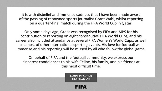 El presidente de la FIFA, Gianni Infantino, envió hoy un comunicado oficial sobre la muerte de Wahl."Con incredulidad e inmensa tristeza he tenido conocimiento del fallecimiento del renombrado periodista deportivo Grant Wahl mientras informaba sobre un partido de cuartos de final de la Copa Mundial de la FIFA en Catar", comenzó diciendo.