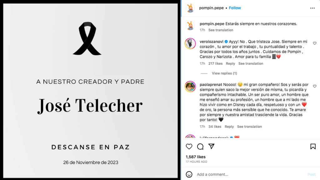 "¡Ayyy! No, qué tristeza, José. Siempre en mi corazón. Tu amor por el trabajo, tu puntualidad y talento. Gracias por todos los años juntos. Cuidamos de Pompín , Carozo y Narizota . Amor para tu familia", le comentó Vero Lozano, quien supo trabajar con Telecher en el programa "AM".