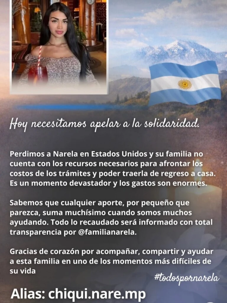 “Hoy necesitamos apelar a la solidaridad. Perdimos a Narela en Estados Unidos y su familia no cuenta con los recursos necesarios para afrontar los costos de los trámites y poder traerla de regreso a casa. Es un momento devastador y los gastos son enormes”, expresaron en el comunicado que comenzó a circular en las últimas horas.