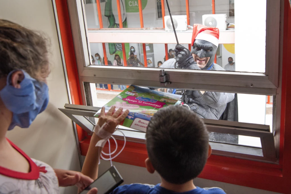 Papá Noel, Batman, Spiderman, Deadpool mujer y las princesas Jasmine y Mérida exhibieron todas sus destrezas para celebrar la Navidad junto a las y los pacientes. Repitiendo una modalidad empleada en el Día de las Infancias, pudieron acercarse a las ventanas y dejarles un presente y un saludo personalizado.