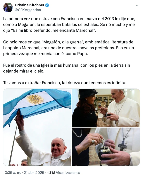 Tras conocerse la muerte del Papa Francisco, gran cantidad de figuras de todo el mundo se expresaron en las redes sociales. Esto mismo sucedió con la expresidenta, Cristina Kirchner, quien compartió unas sentidas palabras en su cuenta de X.