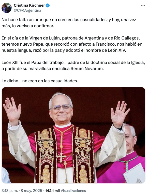 Tras la asunción del Papa León XIV, Cristina Kirchner se expresó en las redes y su mensaje se hizo rápidamente viral.