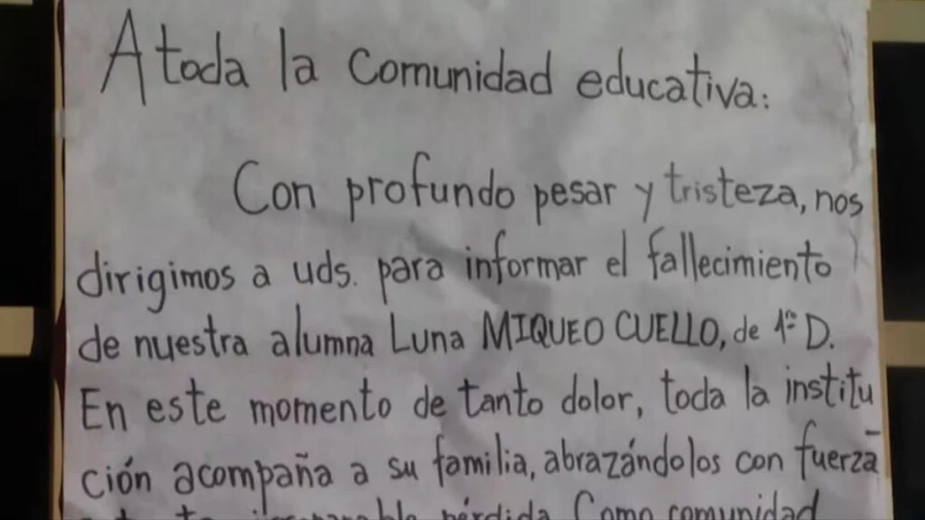 Mientras se esperan los resultados de la autopsia y las pericias, la Justicia busca reconstruir con precisión qué ocurrió en el patio de la escuela y si hubo responsabilidades por parte de los adultos a cargo. La institución, por su parte, expresó su dolor a través de un comunicado: “Con profundo pesar y tristeza, nos dirigimos a ustedes para informar el fallecimiento de nuestra alumna… En este momento de tanto dolor, la institución acompaña a su familia”.