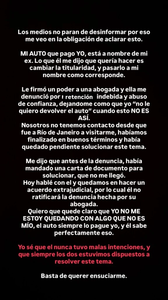 "Ella me denunció por retención indebida y abuso de confianza, dejándome como que yo 'no le quiero devolver el auto' cuando esto NO ES ASÍ", se defendió Páez. Además, aclaró que desde que Zanoni fue a visitarla a Río de Janeiro (durante su detención) no tenían contacto, pero que habían "finalizado en buenos términos y había quedado pendiente solucionar este tema".
