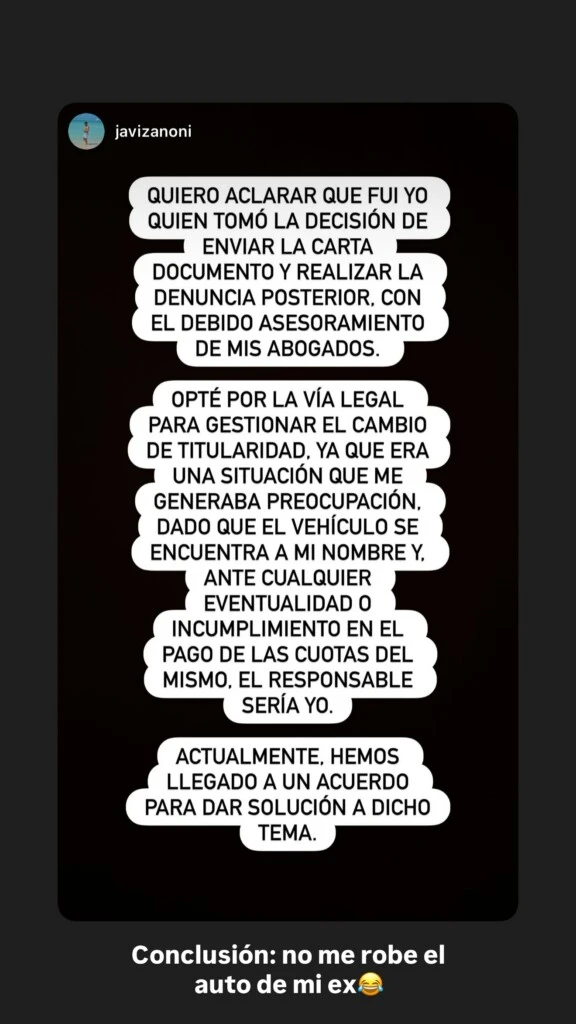 Lejos de guardar rencor, Páez cerró su descargo bancando a su expareja. "Yo sé que él nunca tuvo malas intenciones, y que siempre los dos estuvimos dispuestos a resolver este tema", escribió, y coronó la situación reposteando el comunicado de Zanoni con una frase que resume el insólito enredo: "Conclusión: no me robé el auto de mi ex".