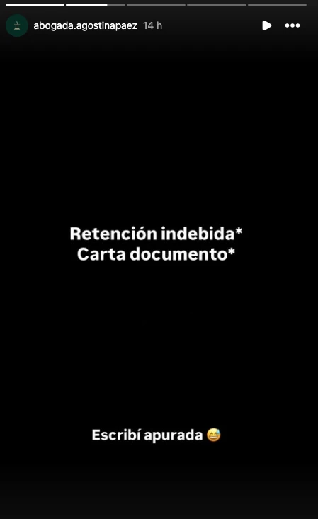 En medio de su furioso descargo, la abogada cometió un par de errores de tipeo al referirse a la "carta de documento" y a la "retención" (que escribió sin acento). Minutos después, subió otra historia aclarando: "Retención indebida / Carta documento / Escribí apurada", junto a un emoji sonriente con una gota de sudor.