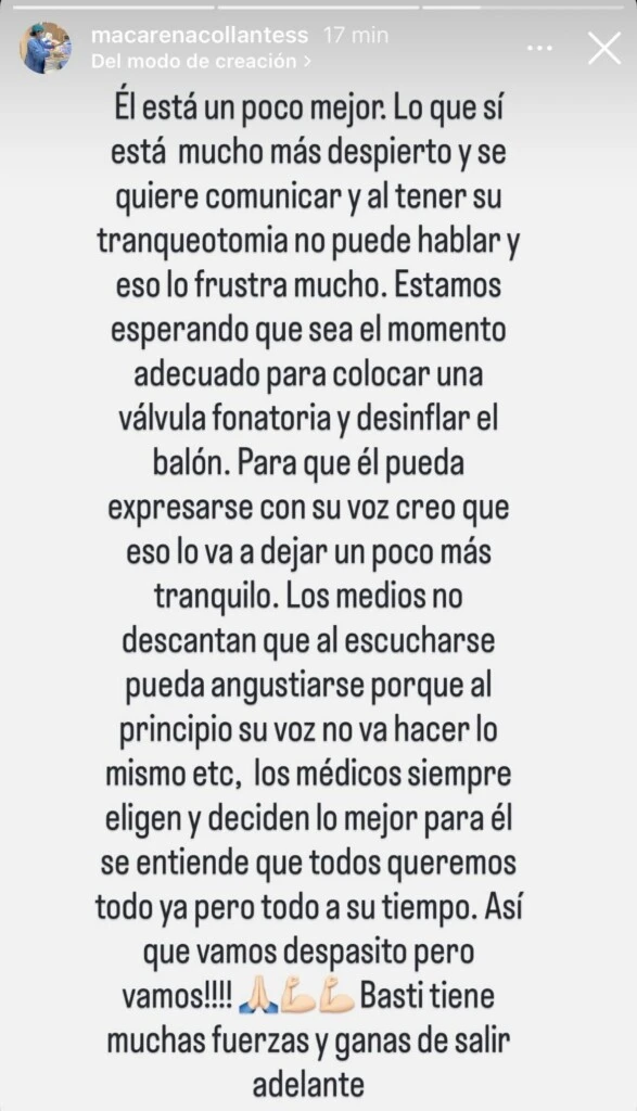 En paralelo, Macarena compartió otros avances que trajeron algo de alivio en medio de la internación. “Basti hace días que ya no siente dolor y estuvimos un poco disfrutando de esos avances”, escribió.