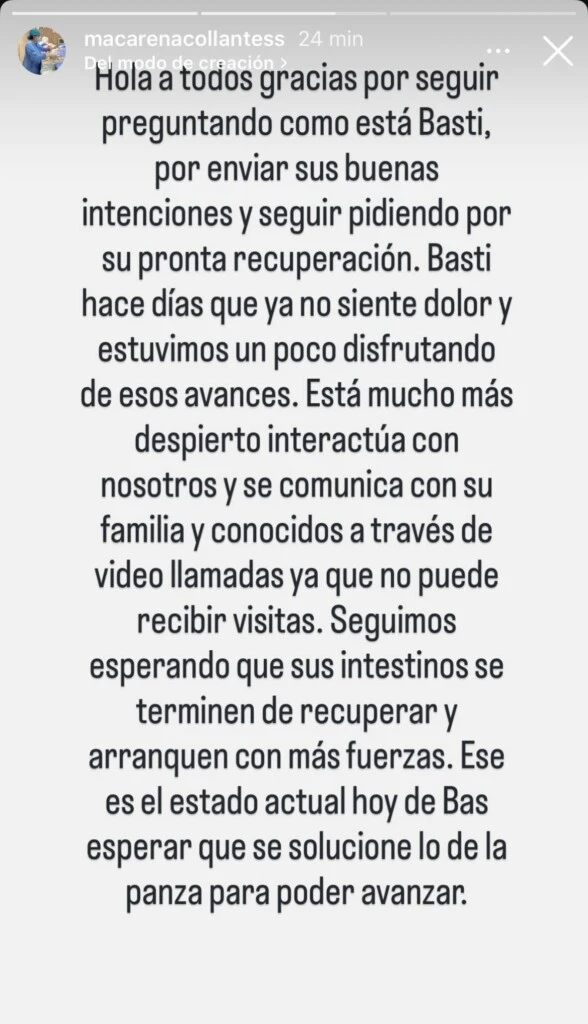 Sin embargo, todavía quedan aspectos médicos por resolver antes de dar nuevos pasos en su recuperación. “Seguimos esperando que sus intestinos se terminen de recuperar y arranquen con más fuerzas. Ese es el estado actual hoy de Basti”, explicó.