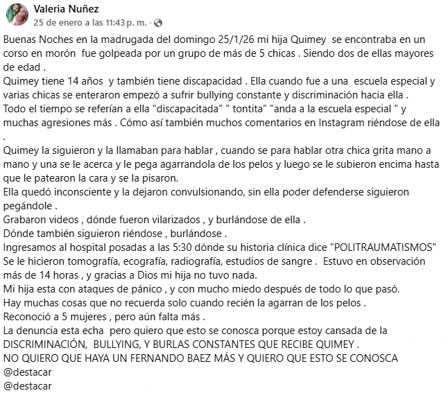 “Buenas noches, en la madrugada del domingo 25/1/26 mi hija Quimey se encontraba en un corso en Morón fue golpeada por un grupo de más de 5 chicas. Siendo dos de ellas mayores de edad. Quimey tiene 14 años y también tiene discapacidad. Ella cuando fue a una escuela especial y varias chicas se enteraron empezó a sufrir bullying constante y discriminación hacia ella. Todo el tiempo se referían a ella ‘discapacitada’, ‘tontita’, ‘anda a la escuela especial' y muchas agresiones más. Cómo así también muchos comentarios en Instagram riéndose de ella. Quimey la siguieron y la llamaban para hablar, cuando se para hablar otra chica grita ‘mano a mano’ y una se le acerca y le pega agarrándola de los pelos y luego se le subieron encima hasta que le patearon la cara y se la pisaron. Ella quedó inconsciente y la dejaron convulsionando, sin ella poder defenderse siguieron pegándole. Grabaron videos dónde fueron viralizados y burlándose de ella. Dónde también siguieron riéndose, burlándose. Ingresamos al Hospital Posadas a las 5:30 dónde su historia clínica dice "POLITRAUMATISMOS". Se le hicieron tomografía, ecografía, radiografía, estudios de sangre. Estuvo en observación más de 14 horas y gracias a Dios mi hija no tuvo nada. Mi hija está con ataques de pánico y con mucho miedo después de todo lo que pasó. Hay muchas cosas que no recuerda solo cuando recién la agarran de los pelos. Reconoció a 5 mujeres pero aún falta más. La denuncia esta hecha, pero quiero que esto se conozca porque estoy cansada de la discriminación, bullying, y burlas constantes que recibe Quimey. No quiero que haya un Fernando Báez más y quiero que esto se conozca”.