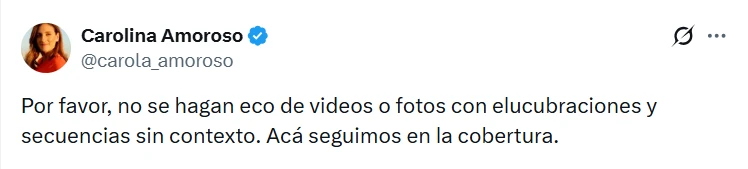 Para frenar la circulación de versiones sin contexto, la propia Carolina Amoroso salió al cruce de esas especulaciones desde su cuenta oficial de X, donde escribió: “Por favor, no se hagan eco de videos o fotos con elucubraciones y secuencias sin contexto. Acá seguimos en la cobertura”.