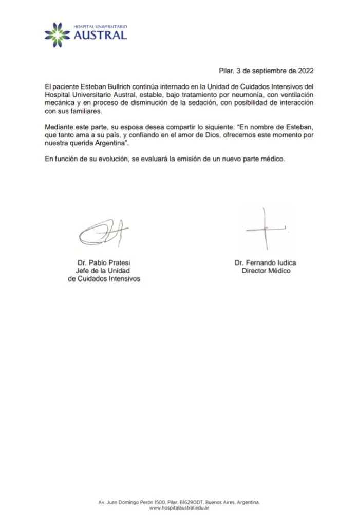 El documento está firmado por por los doctores Pablo Pratesi, jefe de la Unidad de Cuidados Intensivos, y Fernando Iudica, Director Médico del nosocomio. "El paciente Esteban Bullrich continúa ingresado en la Unidad de Cuidados Intensivos del Hospital Universitario Austral, estable, bajo tratamiento por neumonía, con ventilación mecánica y en proceso de disminución de la sedación, con posibilidad de interacción con sus familiares", afirmaron.