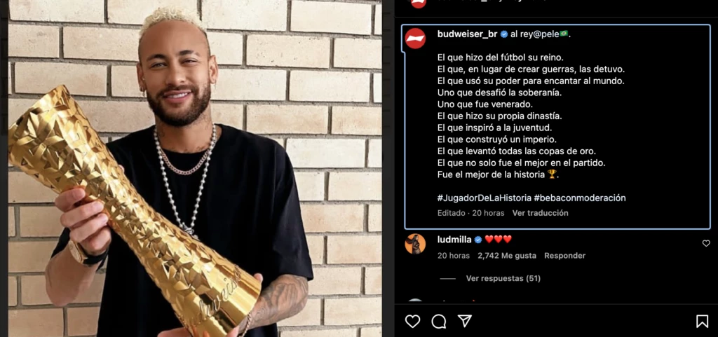 "Hoy es un día muy especial para mí. Quería compartirles que fui invitado por Budweiser para homenajear a Pelé con el trofeo 'Player of the history'. Para mí es una honra inmensa formar parte de este momento", declaró Neymar en un vídeo publicado en Instagram.