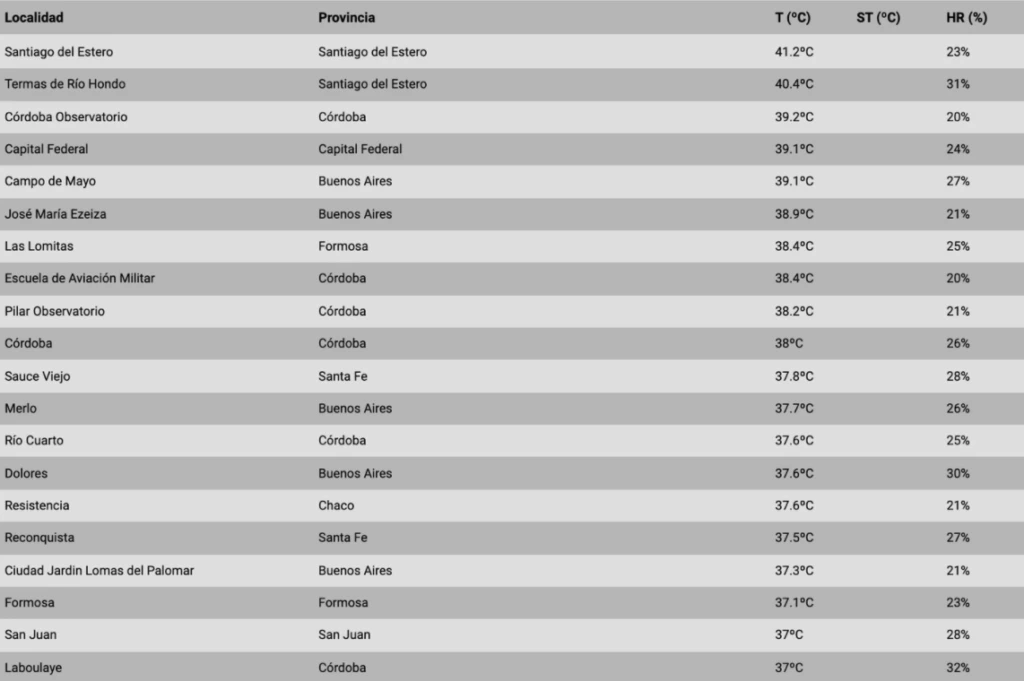 Según los datos presentados por el Servicio Meteorológico Nacional, al rededor de las 16.00, la Ciudad de Buenos Aires trepó a los 41,1°, “la temperatura más alta desde 1906″. Por su parte, la capital santiagueña superó al mediodía los 41°C, mientras que en Córdoba se paraba en los 39,2 °C a la misma hora del día.