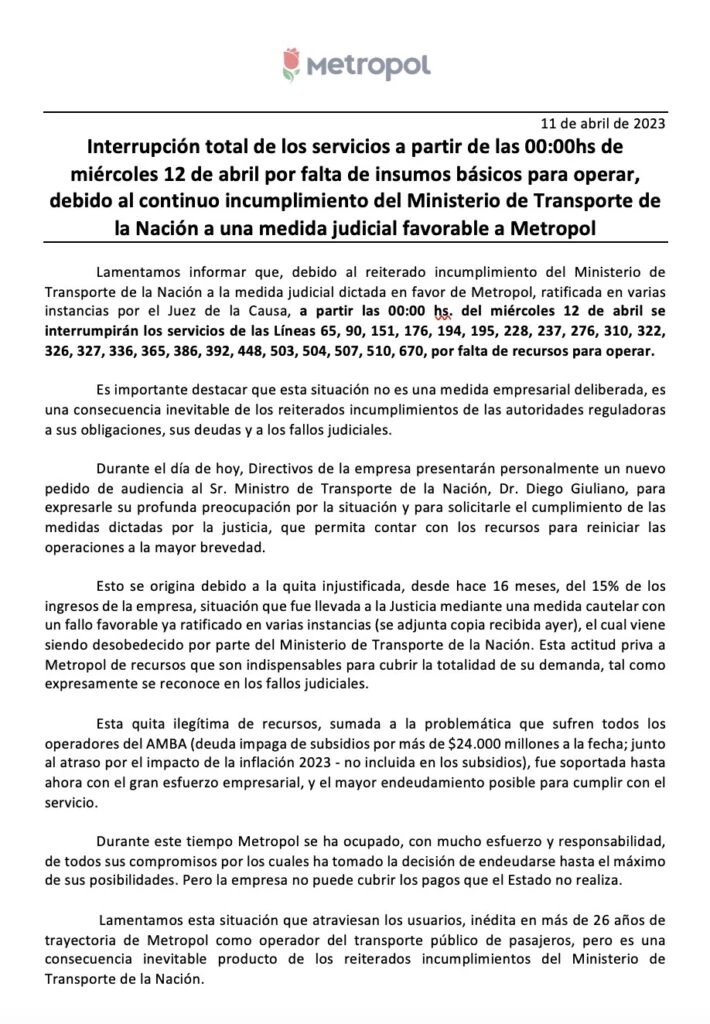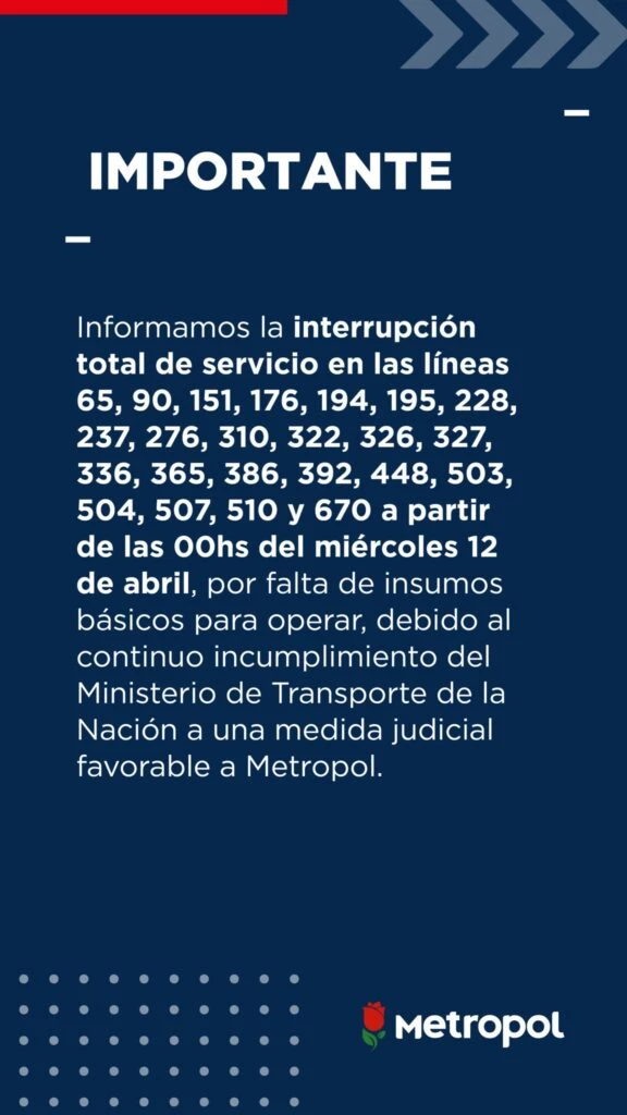 “Informamos la interrupción total de servicio en las líneas 65, 90, 151, 176, 194, 195, 228, 237, 276, 310, 322, 326, 327, 336, 365, 386, 392, 448, 503, 504, 507, 510 y 670 a partir de las 00 del miércoles 12 de abril, por falta de insumos básicos para operar debido al continuo incumplimiento del Ministerio de Transporte de la Nación a una medida judicial favorable a Metropol”, informó la empresa a través de sus redes sociales.