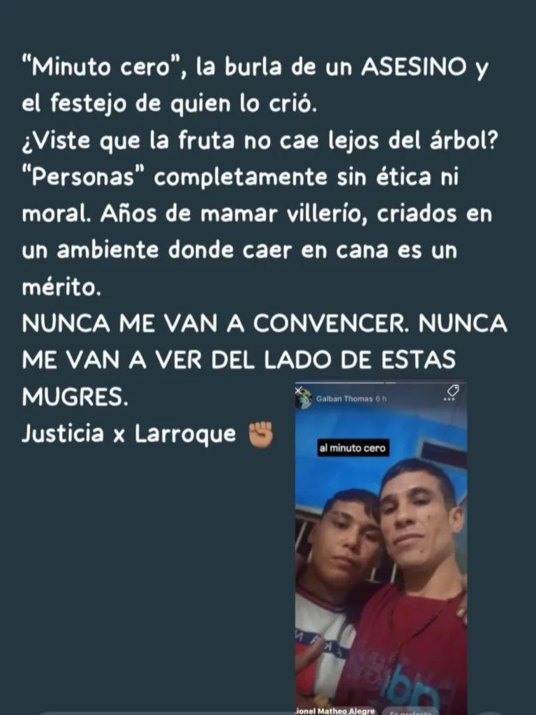 En uno de los posteos más extensos, Yami escribió: “Minuto cero”, la burla de un ASESINO y el festejo de quien lo crió. ¿Viste que la fruta no cae lejos del árbol? 'Personas' completamente sin ética ni moral. Años de mamar villerio, criados en un ambiente donde caer en cana es un mérito. NUNCA ME VAN A CONVENCER. NUNCA ME VAN A VER DEL LADO DE ESTAS MUGRES. Justicia x Larroque".