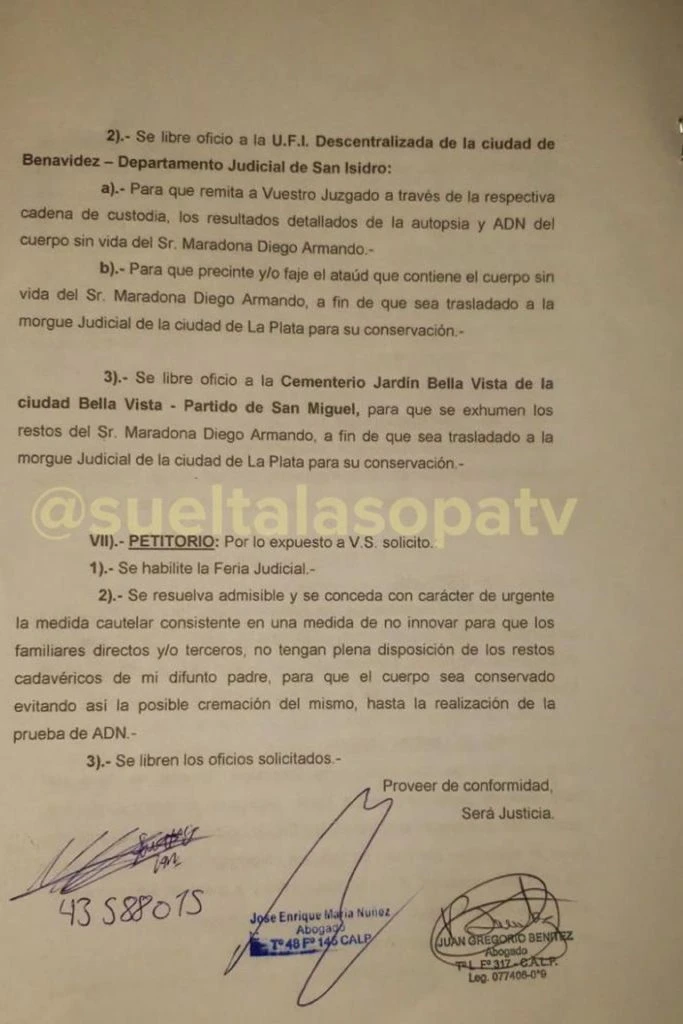 Para poder realizar la prueba de ADN, su abogado, José Núñez, le pidió el viernes a la Justicia que se exhume el cuerpo del Diez. Y no sólo eso: el escrito, que se tramita en el Juzgado de Familia N° 7 de La Plata, solicita que el procedimiento tenga lugar de manera “urgente”.