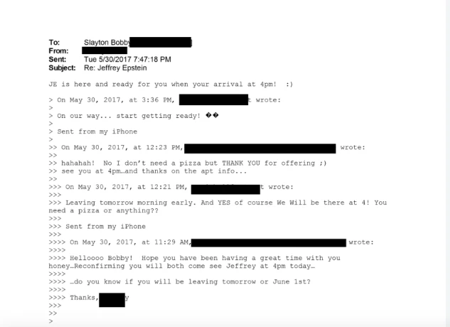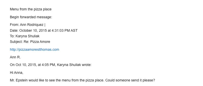 Un ejemplo que circuló masivamente fue un correo de Karyna Shuliak –última novia de Epstein y principal beneficiaria de su patrimonio- pidiendo el menú de Pizza Amore, una pizzería ubicada en las Islas Vírgenes Estadounidenses, cerca de la propiedad de Epstein en Little St. James.