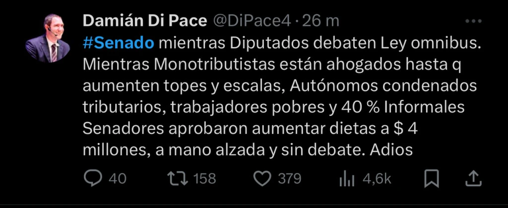 La polémica ya está instalada. Sin debate y a mano alzada, la cámara de senadores aprobó este jueves un aumento de las dietas de 1,9 a 6,7 millones de pesos. Se estima que los funcionarios del Poder Legislativo van a percibir una asignación neta de 4,5 millones de pesos en un contexto en el que el Salario Mínimo Vital y Móvil asciende a 202.800 pesos.