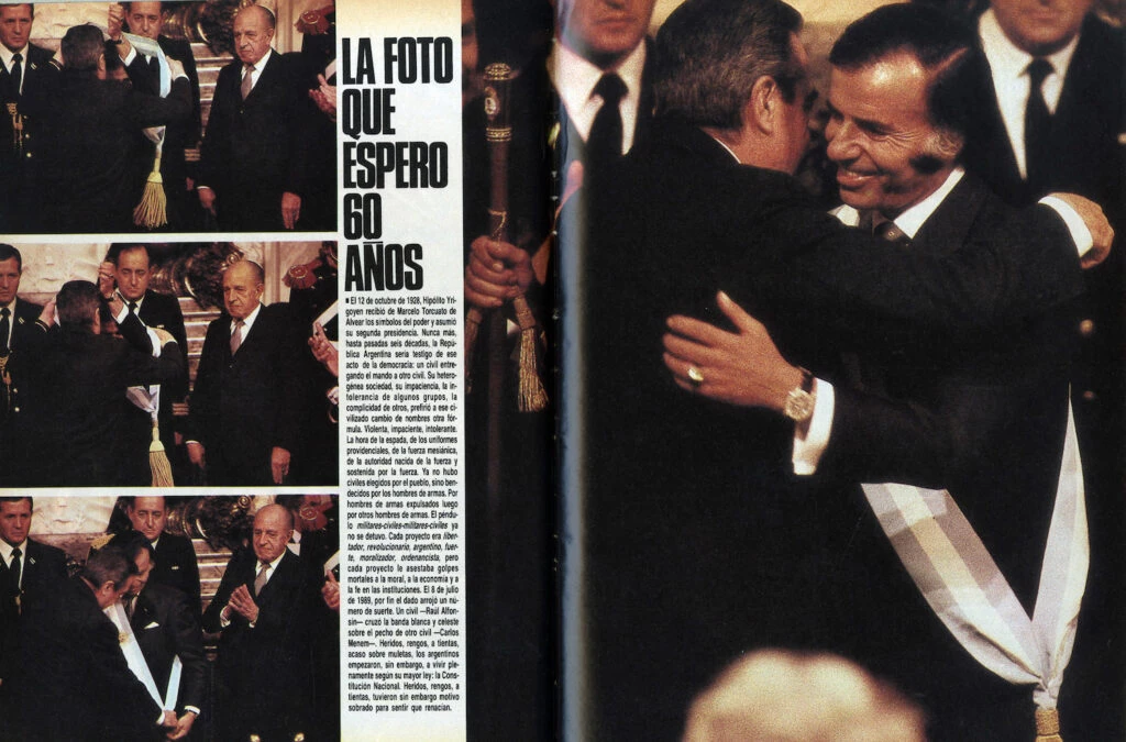 El Cadillac estacionó en la Casa Rosada a las 13.25 y tras una hora quedaron agotados los trámites sucesorios, y Menem con su banda y bastón flamantes fue a despedir al expresidente a la explanada: “Hasta luego. Hasta siempre. Mucha suerte”, le dijo Alfonsín. Después de 60 años, un presidente elegido por el voto popular entregaba el mando a un nuevo mandatario elegido bajo las mismas condiciones democráticas. El 12 de octubre de 1928, Hipólito Yrigoyenrecibió de Marcelo Torcuato de Alvear los símbolos del poder y asumió su segunda presidencia. Esa había sido la última vez.