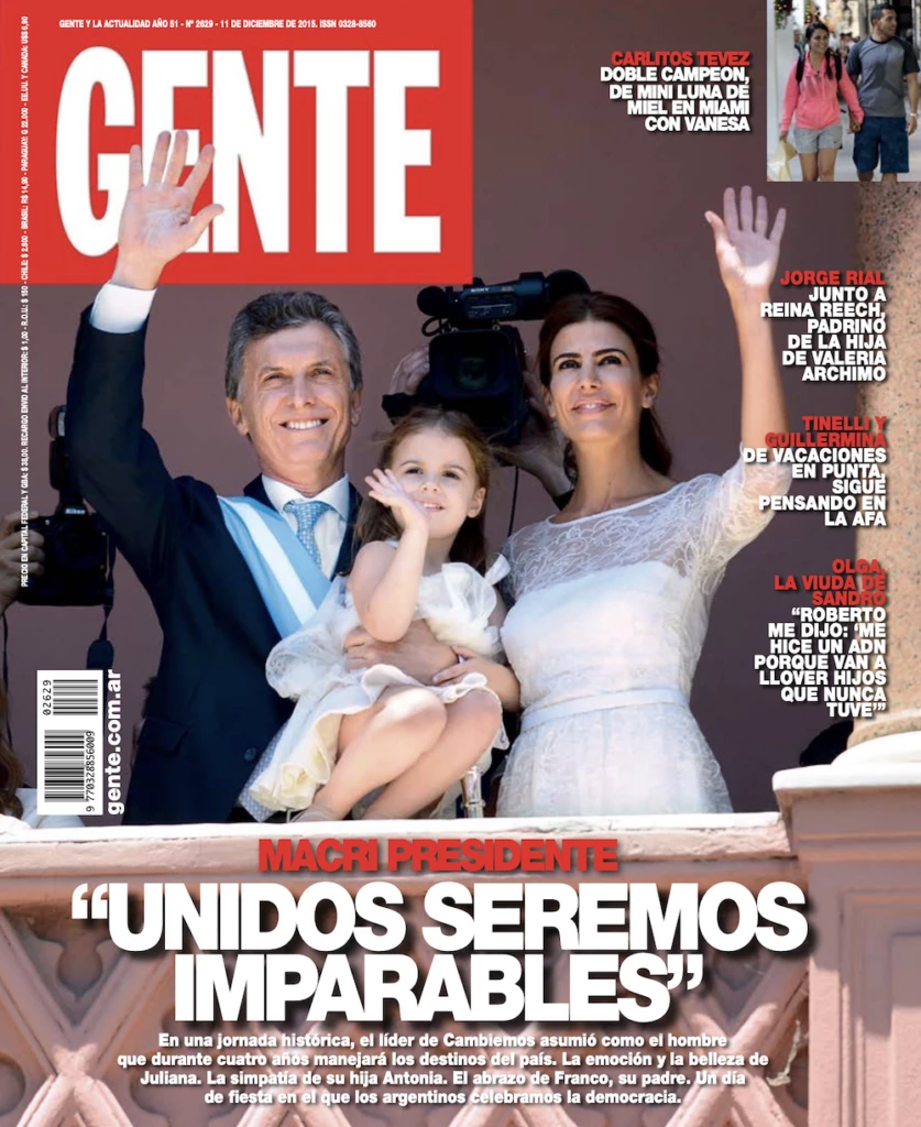 El 10 de diciembre Macri salió temprano rumbo a La Plata para la asunción Vidal, su as de espadas en el principal distrito electoral del país. El trayecto lo hizo en helicóptero y volvió de la misma manera a su departamento donde se preparó para la toma de juramento en el Congreso. Lo acompañaba Juliana, enfundada en un vestido color crudo de su marca, y la pequeña Antonia, que se divertía junto a Valentina, la mayor de Awada con el conde belga Bruno Barbier.