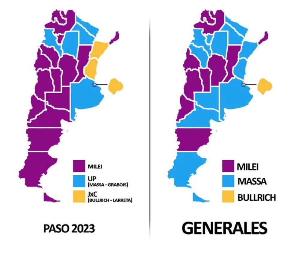 Por su parte, la ola violeta abarcó solamente Córdoba, Santa Fe, Mendoza, Misiones, Jujuy, Salta, San Juan, San Luis, Neuquén y Chubut, provincias en las que Milei ya había triunfado durante las PASO. El detalle es que el libertario no sólo no logró sumar ningún distrito, sino que además no retuvo seis provincias en las que había sido el más votado, las cuales se las arrebató Massa: Tucumán, la Rioja, La Pampa, Río Negro, Santa Cruz y Tierra del Fuego.