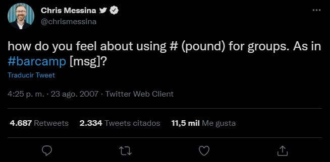 El usuario se llamaba Chris Messina y el 23 de agosto de 2007 había escrito una pregunta a sus seguidores que cambiaria la forma determinar una tendencia en el mundo entero: “¿Qué opinan sobre el uso de # para los grupos? Como en #barcamp [msg]? (sic)”. El histórico tweet en la actualidad cuenta con 4687 retweets y más de 11 mil 500 comentarios.