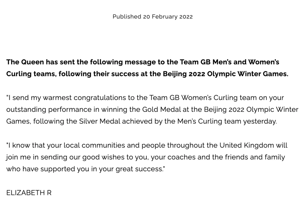 "Mando mi más cálida felicitación a todo el equipo británico femenino de curling por su sobresaliente papel al ganar la medalla de oro en los Juego Olímpicos de Invierno de Beijing 2022 después de la medalla de plata conseguida ayer por el equipo masculino de curling. Estoy segura que vuestras comunidades locales y las personas del resto del Reino Unido se unirán a mí al enviaros estos buenos deseos tanto a vosotras como a vuestros entrenadores, amigos y familia, que os han apoyado en este gran éxito", dice el texto que se publico en el sitio oficial de la Familia Real.