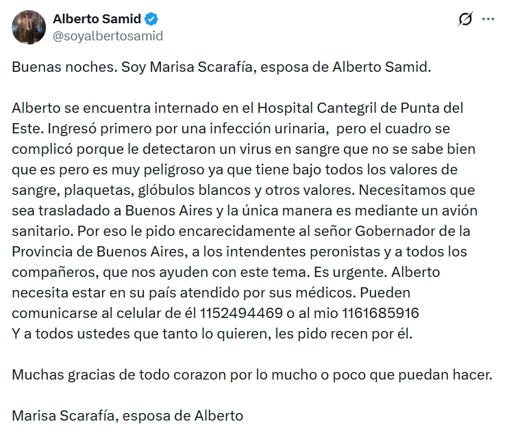 “Alberto se encuentra internado en el Hospital Cantegril de Punta del Este. Ingresó primero por una infección urinaria, pero el cuadro se complicó porque le detectaron un virus en sangre que no se sabe bien qué es pero es muy peligroso, ya que tiene bajo todos los valores de sangre, plaquetas, glóbulos blancos y otros valores”, expresó Scarafía en el mensaje público.