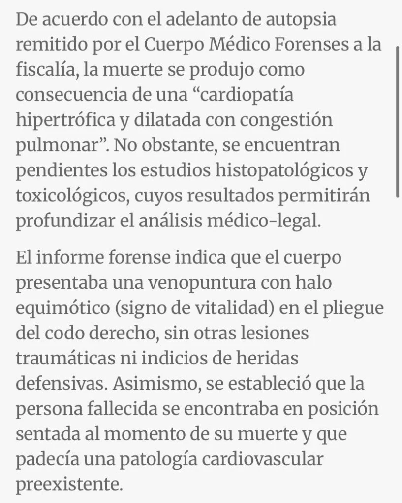 De acuerdo con el informe oficial, el cuerpo presentaba “una venopuntura con halo equimótico (signo de vitalidad) en el pliegue del codo derecho, sin otras lesiones traumáticas ni indicios de heridas defensivas”.