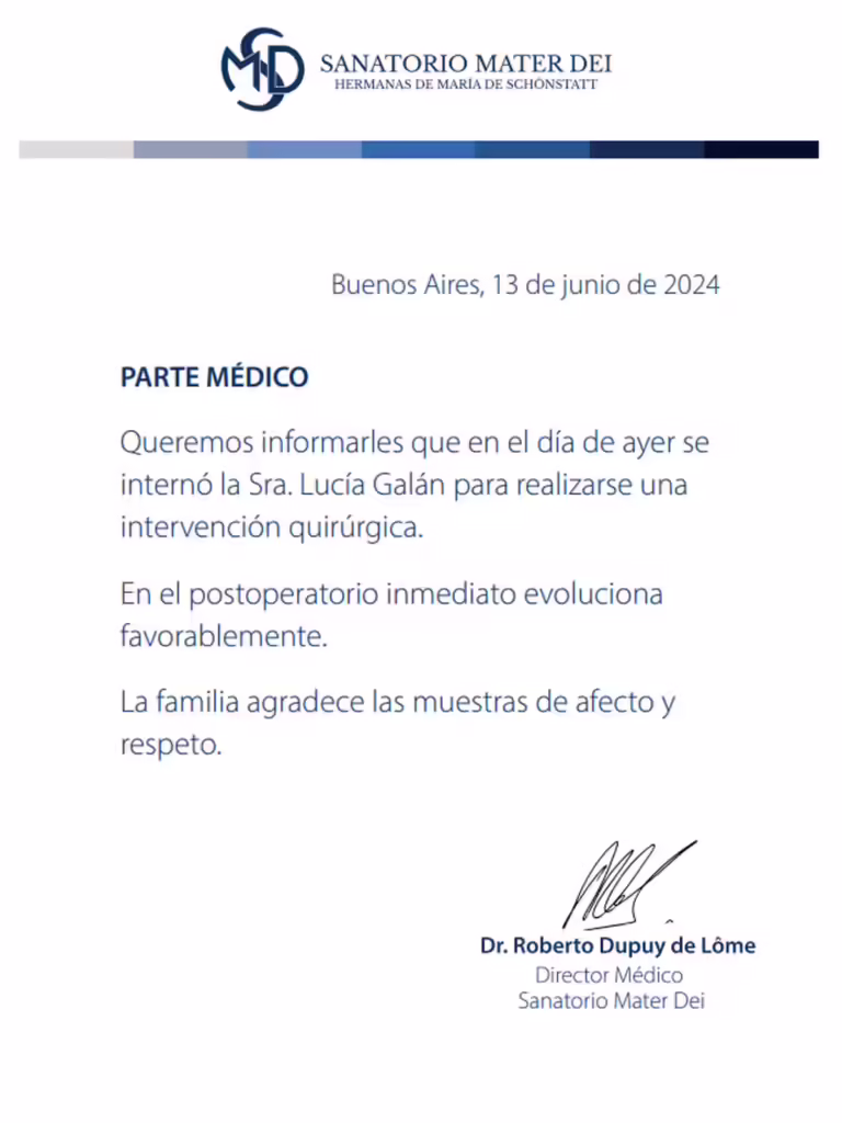 Minutos más tarde también se conoció el parte médico del Sanatorio Mater Dei. “Queremos informarles que en el día de ayer se internó la Sra. Lucía Galán para realizarse una intervención quirúrgica. En el postoperatorio inmediato evoluciona favorablemente”, indicaron los especialistas a cargo de la cantante.