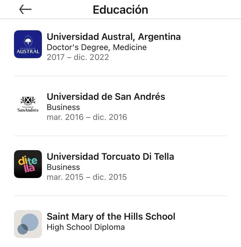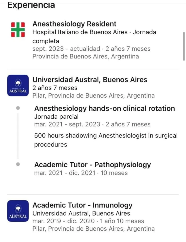 En septiembre de 2023 comenzó su residencia en anestesiología en el Hospital Italiano de Buenos Aires. Ese ingreso marcó un punto clave en su carrera y fue, también, uno de los pocos momentos que compartió públicamente: lo anunció en LinkedIn, la única red social que mantuvo activa hasta ahora.