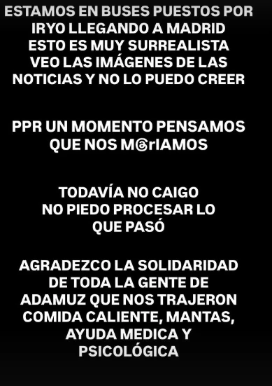 Más tarde, ya camino a Madrid en colectivos dispuestos por la empresa ferroviaria, el rosarino compartió su mensaje más íntimo y conmovedor. “Esto es muy surrealista, veo las imágenes en las noticias y no lo puedo creer. Por un momento pensamos que nos moríamos”, escribió. Visiblemente afectado, reconoció que aún no logra dimensionar lo vivido: “Todavía no caigo, no puedo procesar lo que pasó”.