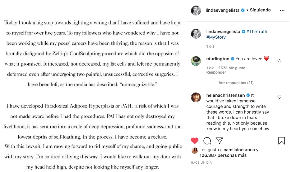 "Honestamente tengo que decir que rompí en llanto al leer esto. No solo porque en lo más profundo sabía que atravesabas algo muy personal y horrible pero también porque pienso en todas las cicatrices que la vida deja en todos, ya sea físicas como emocionales y todo lo que sufrimos mayormente solos y en silencio", escribió en los comentarios Helena Christensen. La top terminó su statement agradeciéndole: "Gracias por ser bella por dentro y por fuera".