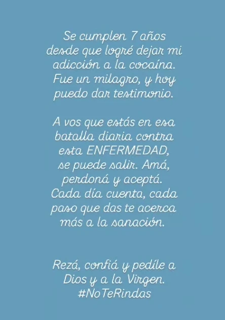Hasta que, este miércoles, el militante de Unión por la Patria compartió un posteo en su cuenta de Instagram, en el que reveló lo que está atravesando. "Se cumplen 7 años desde que logré dejar mi adicción a la cocaína. Fue un milagro, y hoy puedo dar testimonio", comenzó expresando.