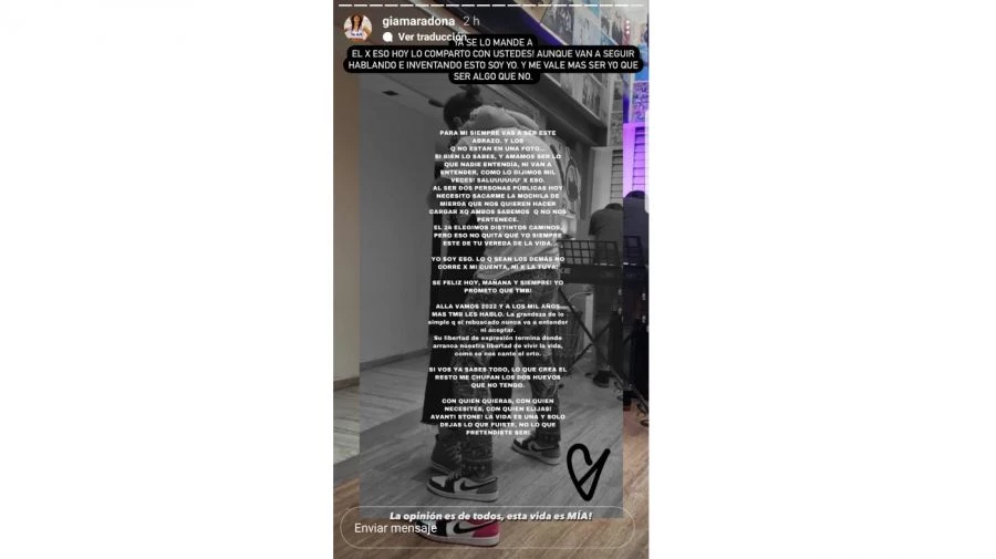 “Yo soy eso. ¡Lo que sean los demás, no corre por mi cuenta, ni por la tuya! Sé feliz hoy, mañana y siempre. Yo prometo que también. Allá vamos 2022 y a los mil años más también les hablo. La grandeza de lo simple que el rebuscado nunca va a entender ni aceptar. Su libertad de expresión termina donde arranca nuestra libertad de vivir la vida, como se nos cante el ort*”, añadió Gianinna de forma tajante. Luego, concluyó: “Si vos sabes todo, lo que crea el resto me chup* los dos huev* que no tengo. Con quien quieras, con quien necesites, con quien elijas. ¡Avanti, Stone! La vida es una sola y sólo dejas lo que fuiste, no lo que pretendiste ser. ¡La opinión es de todos, esta vida es mía!”.