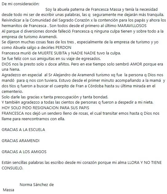 En esta línea, agregó: "Al parque de diversiones donde falleció Francesca, que ninguna culpa tienen, y sobre todo a la empresa de turismo. Se dijeron muchas cosas feas de los tres, especialmente de la empresa de turismo, y yo, como abuela, salgo a decirles: PERDÓN".
