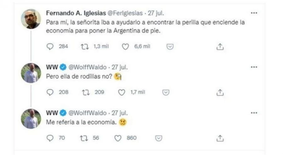 Es que, luego de que saliera a la luz que Florencia se reunió con el presidente Alberto Fernández para pedirle trabajo para los actores, los diputados nacionales tuvieron un polémico intercambio de tuits: "Para mí, la señorita iba a ayudarlo a encontrar la perilla que enciende la economía para poner a la Argentina de pie", expresó irónico Iglesias y Wolff le contestó: "¿Pero ella de rodillas no?".