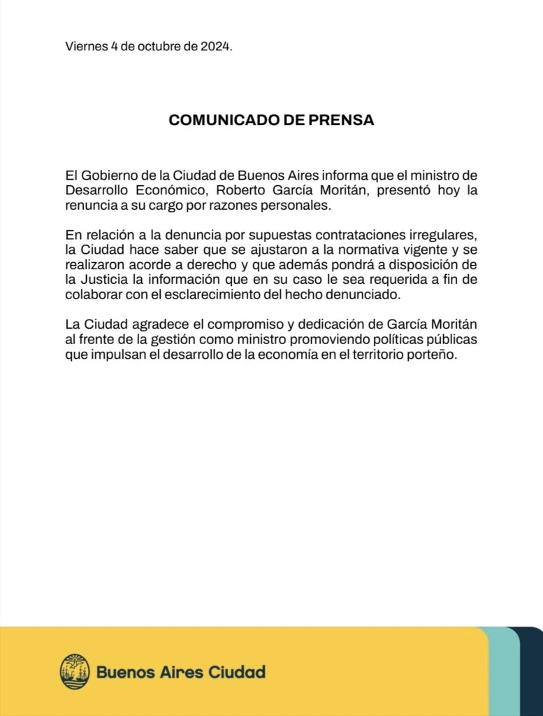 Este viernes en horas de la tarde tras una reunión con las autoridades del Gobierno de la ciudad de Buenos Aires, el economista renunció a su cargo. A través de un comunicado de prensa informaron: "El ministro de Desarrollo Económico, Roberto García Moritán, presentó hoy la renuncia a su cargo por razones personales".