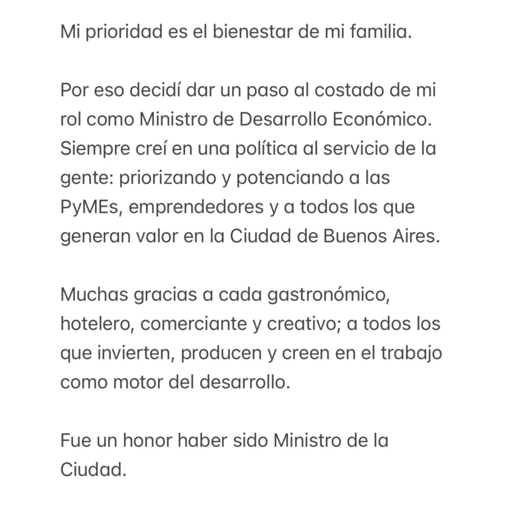 "Mi prioridad es el bienestar de mi familia. Por eso decidí dar un paso al costado de mi rol como Ministro de Desarrollo Económico. Siempre creí en una política al servicio de la gente: priorizando y potenciando a las Pymes, emprendedores y a todos los que generan calor en la Ciudad de Buenos Aires", comenzó diciendo.