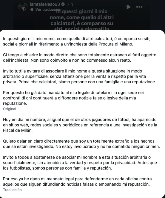 El nombre del delantero portugués, figura del Milan, comenzó a circular en medios y redes sociales junto al de otros deportistas de elite mencionados en la causa. Frente a la repercusión, el jugador eligió fijar postura con un mensaje directo en sus redes.